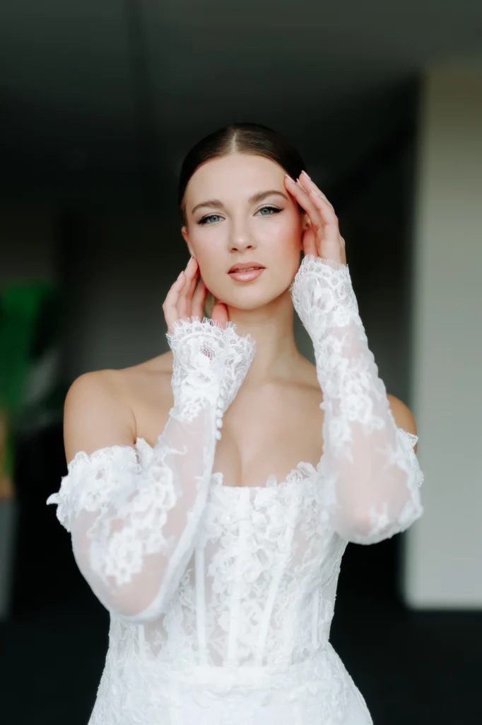 2026-ban a kiegészítők nem uralják, hanem finoman kiegészítik a menyasszonyi ruhát. Letisztult vagy csipkeszélű fátylak, modern fejdíszek, kesztyűk amelyek harmonikusan illeszkednek a ruha stílusához.